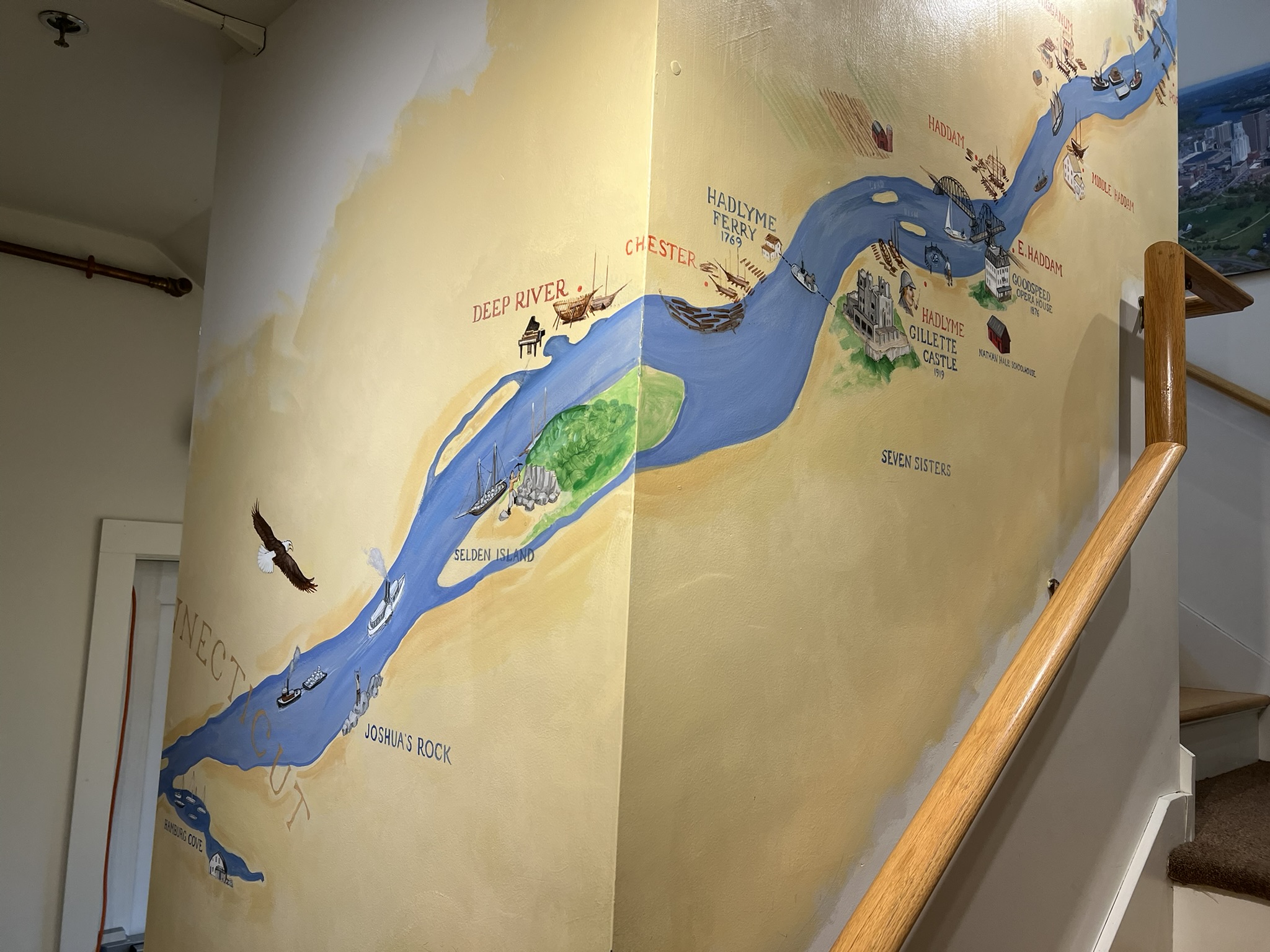 While in Essex, take time to visit the Connecticut River Museum. Adult admission is $15, or borrow a free admission pass from a participating library, or even become a member. There are three exhibit floors. Two floors have permanent displays covering all aspects of the river including the history of transportation, shipbuilding, wartime activities (there is a replica of the Revolutionary War Turtle – the first submarine deployed in combat), recreation, and even a small display dedicated to….shad fishing. During the shad run the museum sets out additional temporary shad fishing displays. A third floor has rotating exhibits. Currently on exhibit through August 3 is “Rising Waters: Flooding on the Connecticut River”, which explores “several devastating floods of the 20th century and poses questions about what we should expect in the future.” Don’t miss the back stairwell’s “vertical gallery” – a delightful mural painted in 2009 by the talented artist Russell Buckingham that provides a whimsical representation of all 410 river miles and the places it passes through. To get even closer to the river, book a trip on one of the museum’s public cruises – the On Rust, a replica of Adriaen Block’s 1614 ship, or the RiverQuest. Cruise tickets include museum admission. For more information, visit the museum’s WEBSITE.
