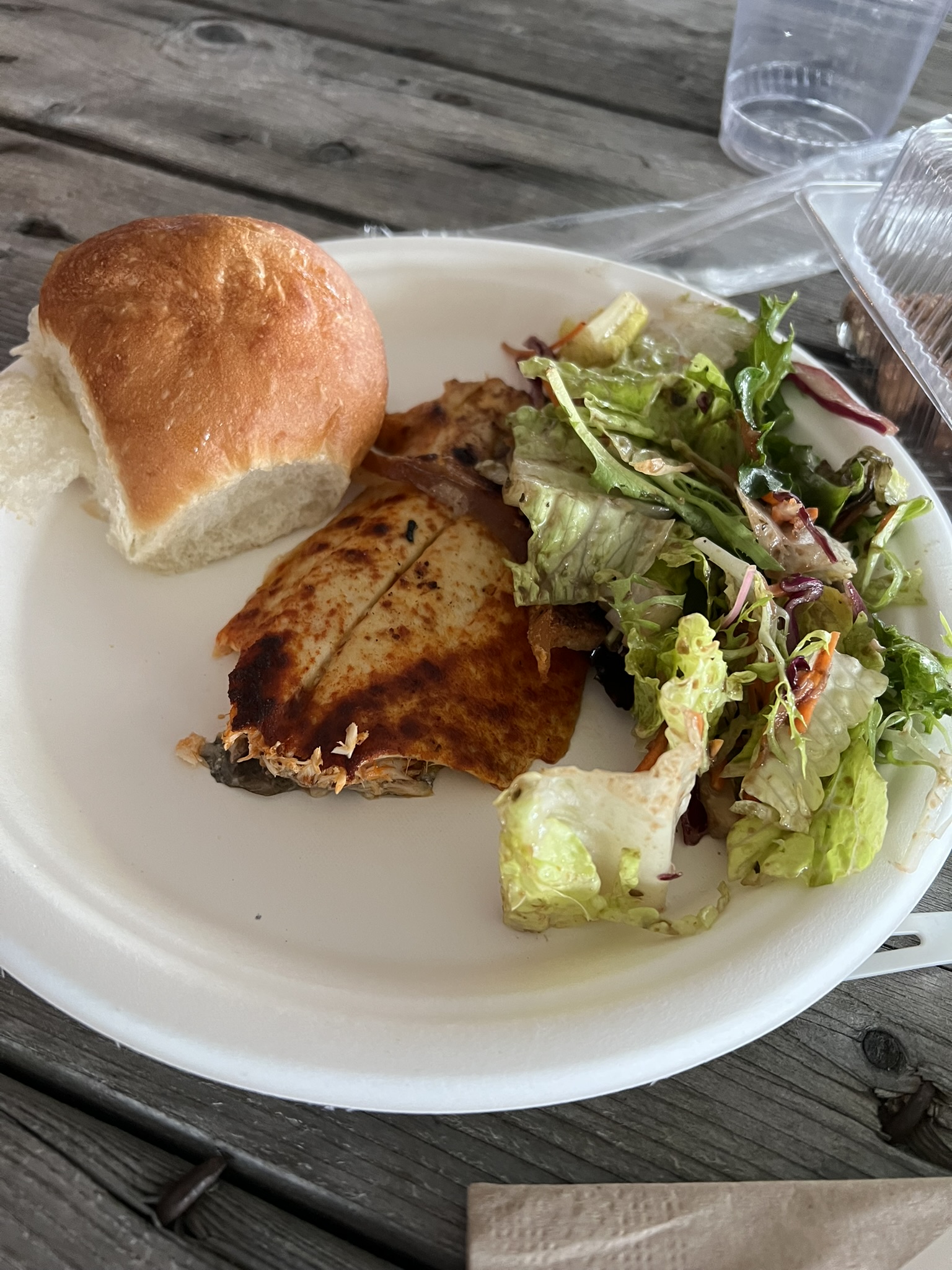 But how DOES it taste? Is it really and truly a “most delicious shad”? I was determined to find out, and bought tickets to the Essex Rotary Club’s 2025 Shad Bake, a tradition that goes back to 1958. Enough shad to feed 450 attendees is cooked around a large fire, nailed with pieces of salt pork to oak planks and seasoned simply with olive oil and paprika. The Shad Bake was held on a rainy Saturday in early June at the Essex Island Marina. I was impressed to see the large turnout given the lousy weather. A Swing Band played festive music from under cover of a tent. Hundreds of chairs were set up under a larger tent and folks good-naturedly formed a long line in the rain once the buffet started. Along with the shad, the meal included salad, rolls, and Lyman Orchards apple pie. Clam chowder, clams and oysters were available for purchase, along with a cash bar for beer, wine and soda. I had my first taste of shad and was pleasantly surprised. It was tasty, and I didn’t encounter a single bone. For a glimpse of what this quintessential event looks like, check out this short VIDEO from the 2024 Shad Bake.