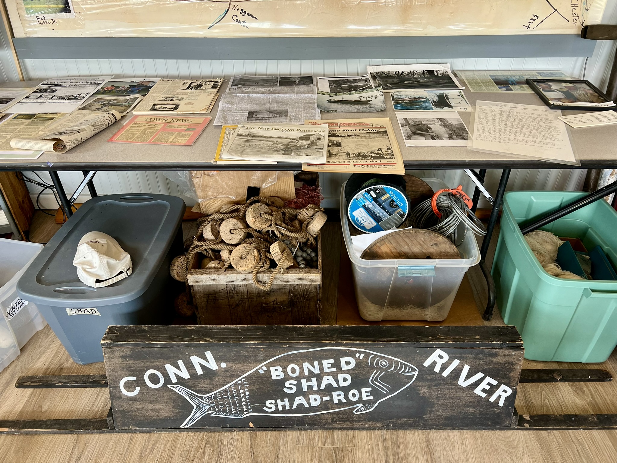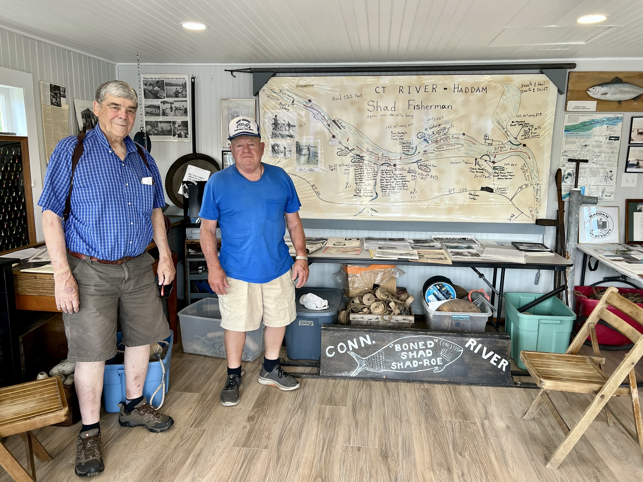 I visited in April and June as preparations were underway. Lisa Malloy, the HHS Executive Director, and two shad fishermen, Jack Calhoun and Fred Hartke, welcomed me and shared a wealth of information about the history of shad. Jack and Fred have been friends since they met in 1948 in the very first 1st grade class at Haddam Elementary School. Both have spent time as commercial shad fishermen (Jack during his high school years, and Fred from high school into the 1970’s). They regaled me with stories of shad fishing, explaining the differences between haul seining and gill nets, and reminiscing about the heyday of the mid-20th century when there would be “5 or 6 boats hauling shad in a 4 to 5 mile section of river,” according to Fred. Shad fishing happened at night, starting at dusk, because the shad could see the nets in the daytime. Now, they said, you’d be lucky to see a handful of boats along the entire stretch from Old Saybrook to Rocky Hill. The cheery one-room museum is chock full of memorabilia, including Bill Maynard’s old boning knives, examples of different nets, numerous photographs and articles, and various DVDs, including interviews with people from the industry, along with the documentary, A Passion for Shad. Following in Dr. Zaientz’s footsteps, Jack and Fred have dedicated many hours to keeping the history of shad alive. Among other things, Fred made some demonstration nets, fabricated the shad weathervane that sits atop the museum, and designed the river map on the white board with the help of his wife’s penmanship. Between now and the museum’s official re-opening, small groups can contact the Haddam Historical Society at 860-345-2400 or contact@haddamhistory.org to arrange a private visit. Keep an eye on the Haddam Shad Museum website for news of the official grand re-opening, and for information on how to donate to help defray the costs of the restoration.
