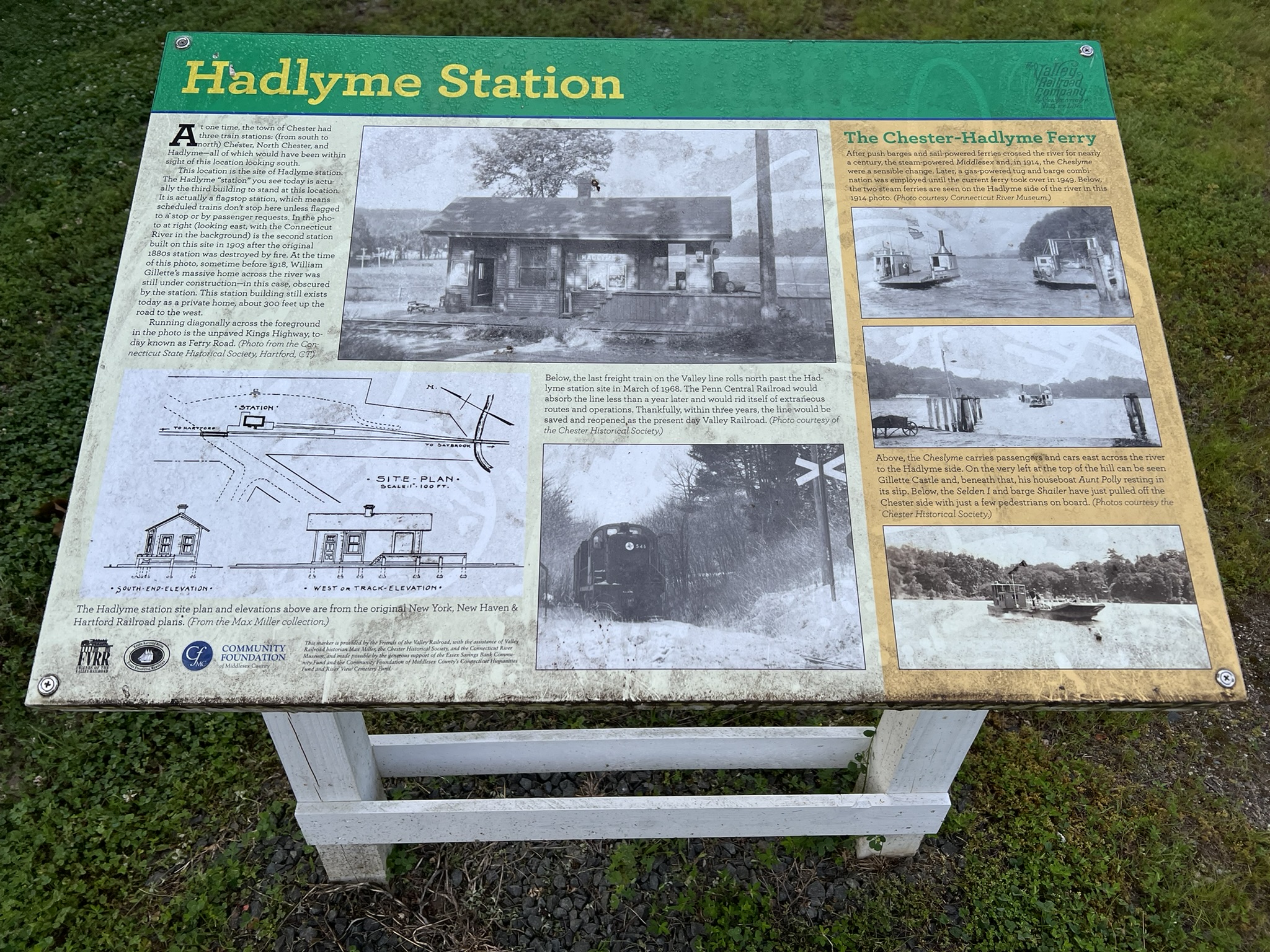 At the Chester park there is a signboard with a diagram of this section of river along with the types of fish that can be found there, and just downstream is an active osprey nest. For an additional bit of history, walk along Ferry Road less than ¼ mile to reach the old Hadlyme Rail Station. There is a signboard explaining the history of the railroad and ferry. In one of the photos you can see the Aunt Polly in the distance, docked on the opposite bank. (If you have your car, I recommend parking by the ferry and walking to the train station, as there is no good place to park along the road.)