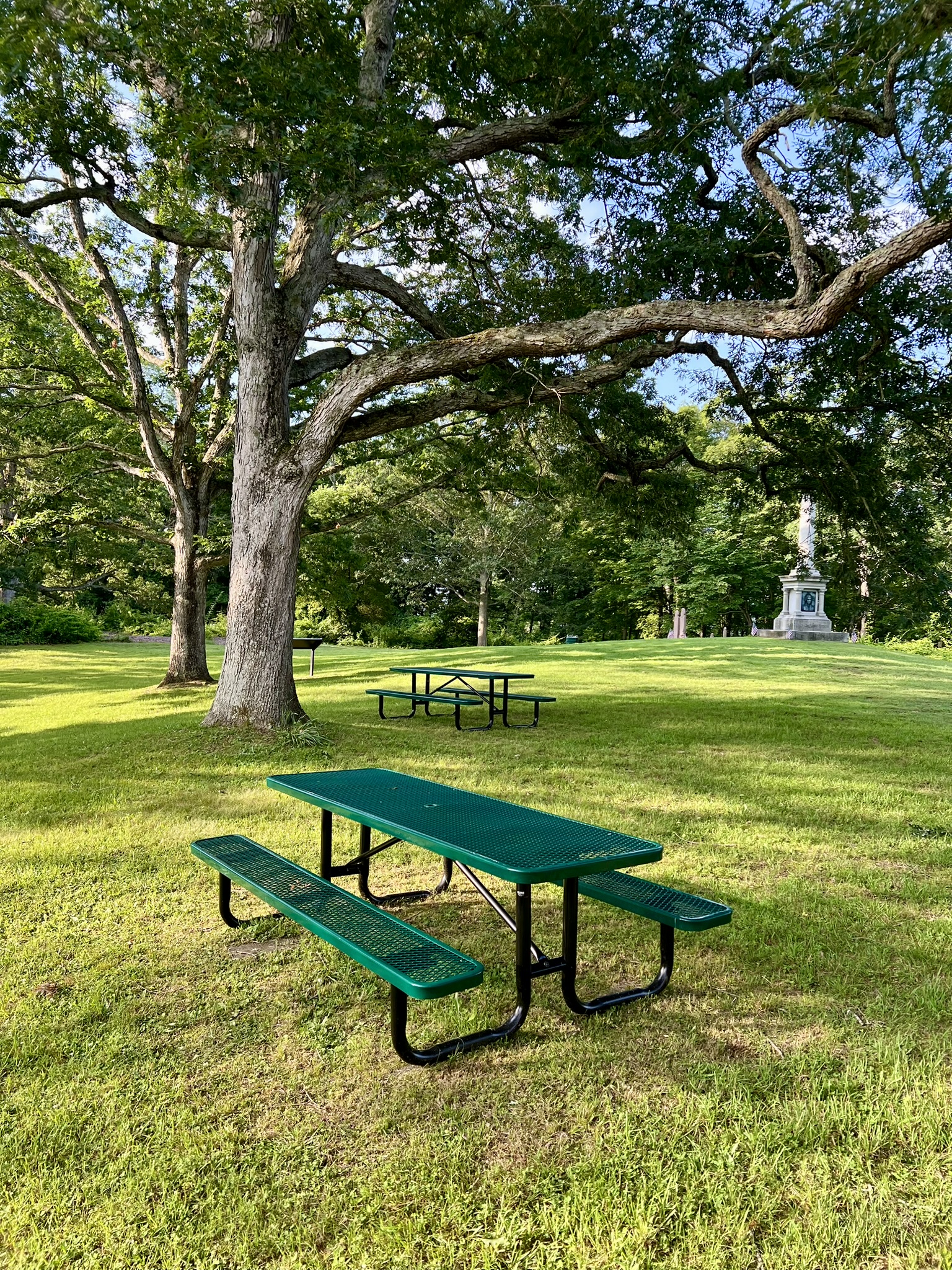 I returned on the first day of summer for a walk, starting at the pier where I encountered a local resident fishing for catfish. From there, I walked across the brand new pedestrian bridge built alongside the historical East Haddam Swing Bridge, which officially opened on June 14, 1913. Upon crossing the bridge I took a left on Route 149, heading up the hill and followed the signs for the Nathan Hale Schoolhouse which sits on a lovely perch above the river. While it was not open at that hour, the grounds were lovely, with several picnic tables and a bench overlooking the river (although the river was somewhat obscured by the foliage). Back at the main road I admired St. Stephen’s Episcopal Church in its “new” location (learn more below in the section on Duncan’s Preserve) and wandered around the adjacent River View Cemetery (not to be confused with the River View Cemetery in Essex that I highlight later on).