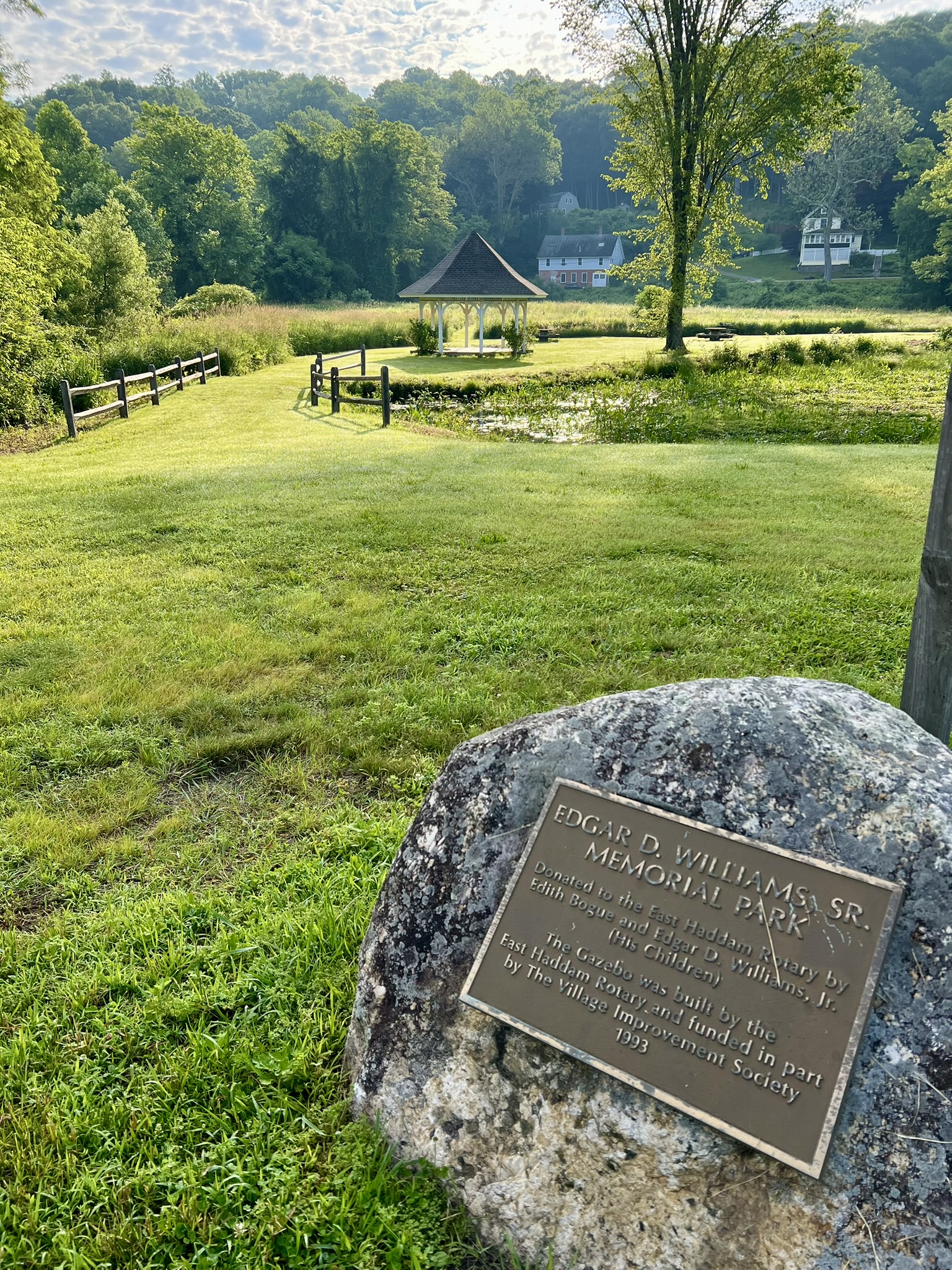 Retracing my steps, I walked down a side street towards the Theater Parking. Opposite the parking entrance I noticed a gazebo. Reading the plaque, I learned this tiny park is the Edgar D. Williams, Sr. Memorial Park, built on land donated to the East Haddam Rotary Club by his children. There is a gazebo and several picnic tables in need of some restoration work. Alongside, there is a small pond where I observed a great blue heron. Crossing the street and the theater parking lot I rested for a moment on a bench with a view to the bridge, then walked up the path to the Goodspeed Opera House. The green below the theater has several picnic tables overlooking the river. Returning across the bridge to my car, I recorded a total walk of 2.2 miles.