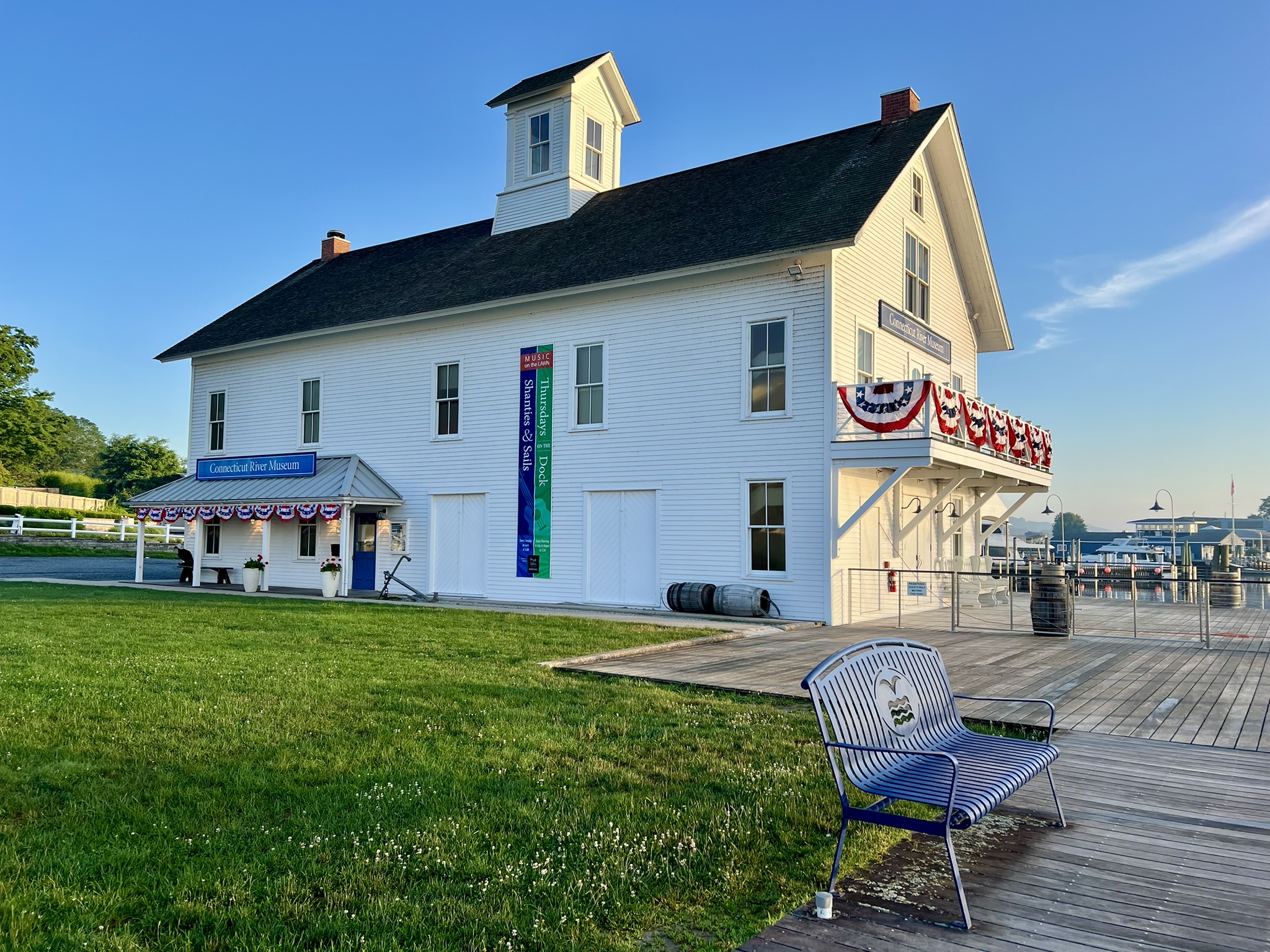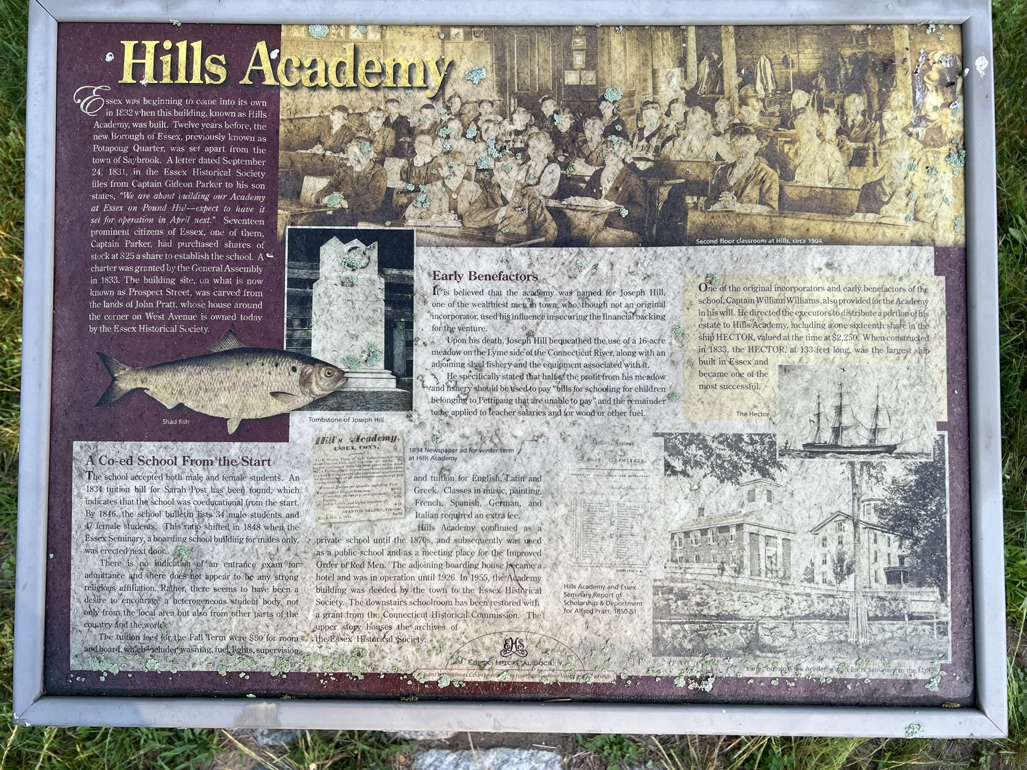 I visited a second time on an early June morning on what was predicted to be a blazing hot day. This time I parked by the Connecticut River Museum (see more information below) for a longer walk. The river mist was thick with the already sweltering temperatures. On the walk back, I experienced a Baader Meinhof phenomenon moment – otherwise known as a frequency illusion. This is the experience of seeing something all around you once you have learned about it, thus giving the illusion that it is more common that it is. An example is when you are in the market for a new/used car, you often start seeing the model you are considering everywhere you go. I noticed a sign reading Historical Site that pointed up Prospect Street, so I decided to loop back that way out of curiosity. I discovered a signboard in front of the Essex Historical Society, which is housed in the former Hills Academy. The Hills Academy was a co-educational school founded in 1832. On the sign was a large photo of….an American Shad, along with a description of how benefactor Joseph Hill, in his will, bequeathed to the school his shad fishery in Old Lyme, directing that the profits be used for scholarships and other school expenses. I now see shad everywhere! Continuing on, I visited the Essex Town Green before arriving back at my car for just over 2 miles.