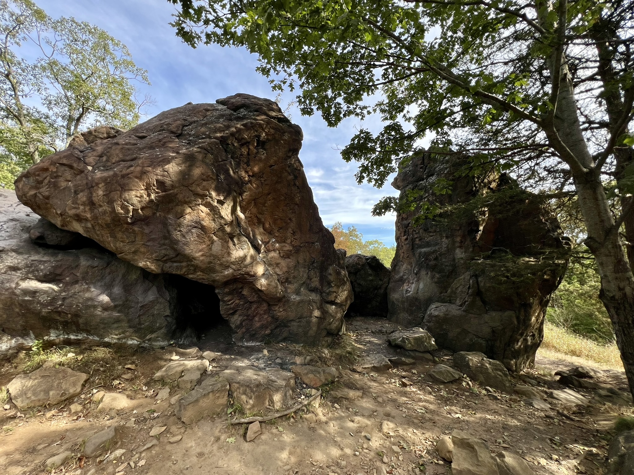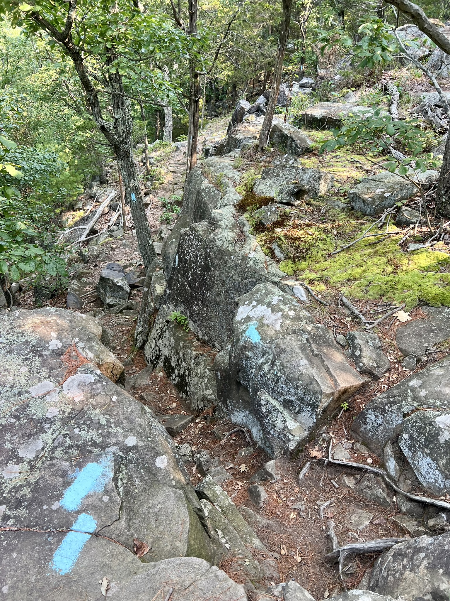 We first walked around the jumble of boulders called Judges Cave. While it is impressive, it is hard to imagine how it made a suitable hiding place for any length of time. We then set off on the blue trail heading north. The trail goes up and down along the ridgeline and is challenging due to the rocky terrain. On several occasions the trail parallels or crosses Baldwin Drive, which is an option for walking a vehicle-free road instead of the more difficult trail. According to the park website, Baldwin Drive was constructed in the 1930s as a Works Progress Administration (WPA) project.
