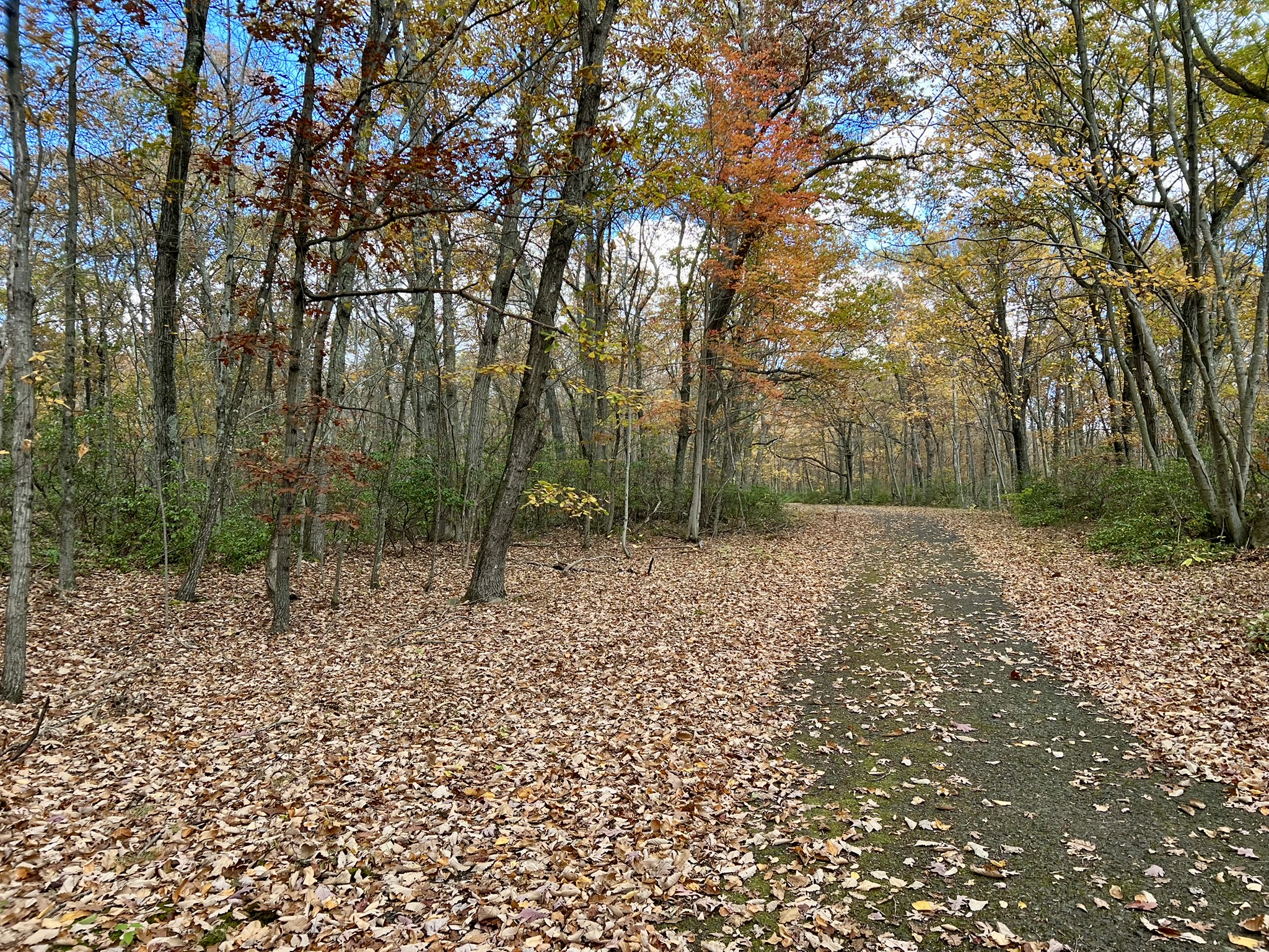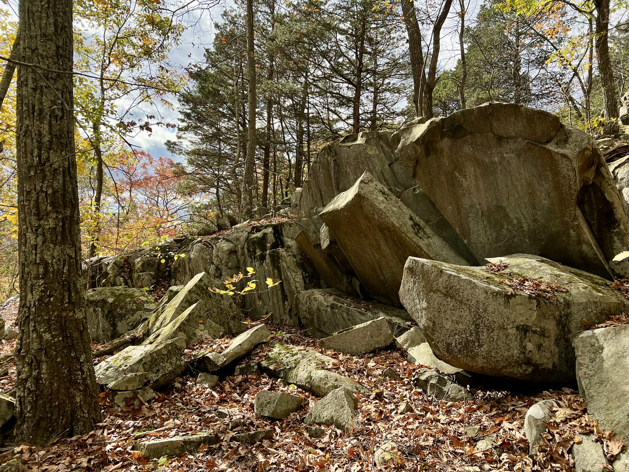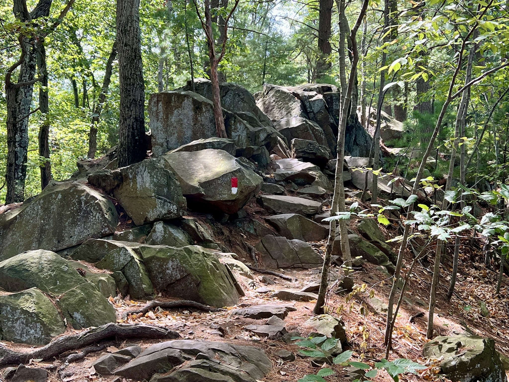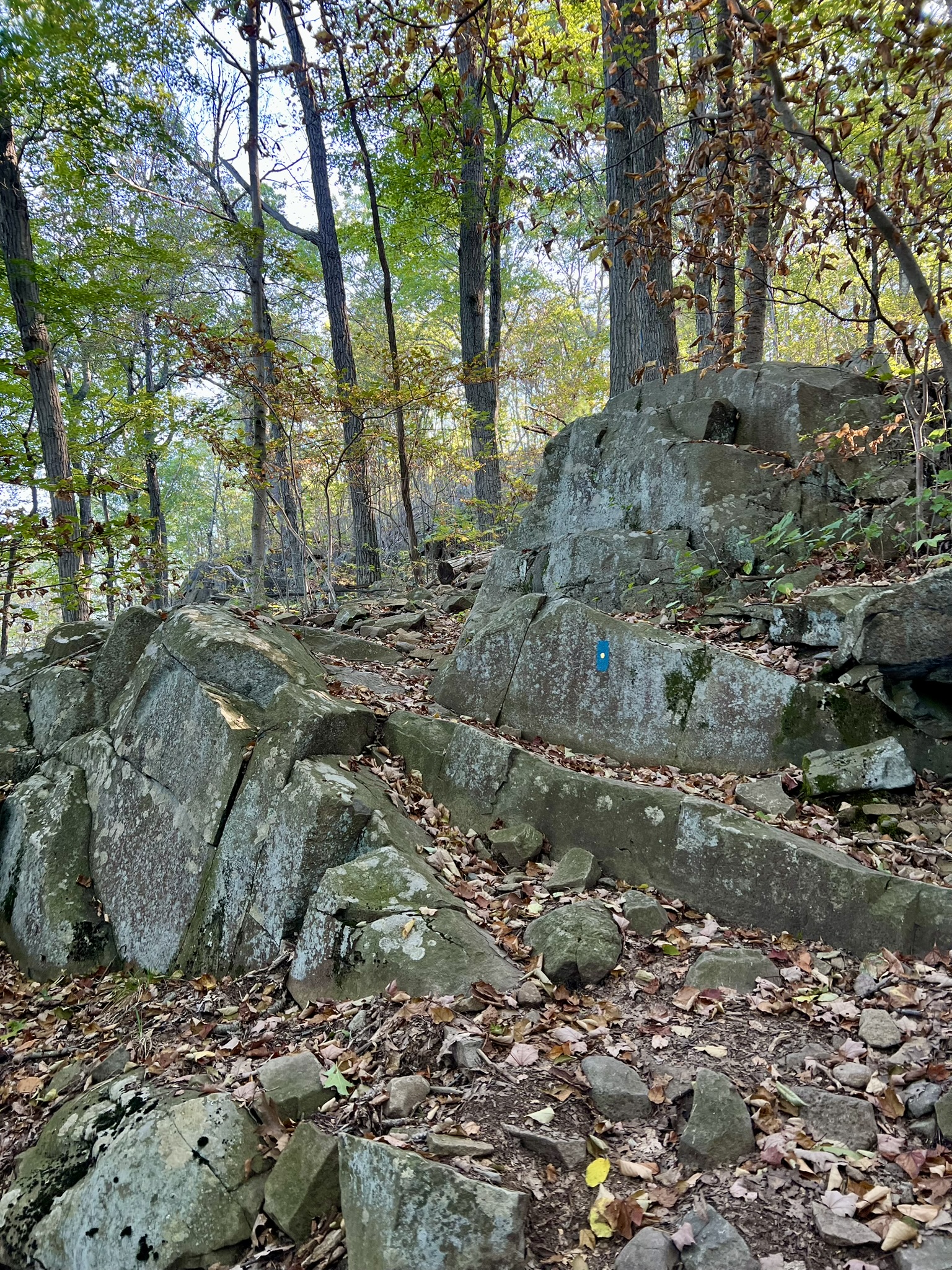 I added to my hike by heading south on Baldwin Drive and taking the purple/orange blazed trail to the right to meet the Regicides Trail. There was a hint of a view that will open up once the leaves fall. I continued south on the blue trail approximately .8 miles to the junction with the blue/white connector trail (formerly the gold trail). Upon reaching Baldwin Drive, I walked north on Baldwin Drive to return to the blue/yellow trail. Upon reaching the junction with the blue/red and red trails I went left on red to see a different section of woods. I located the green connector trail to cut off the bottom loop. This is very poorly marked so a GPS is helpful. I used AllTrails to locate it. Worst case you’ll end up doing the full red loop for an additional ½ mile or so.