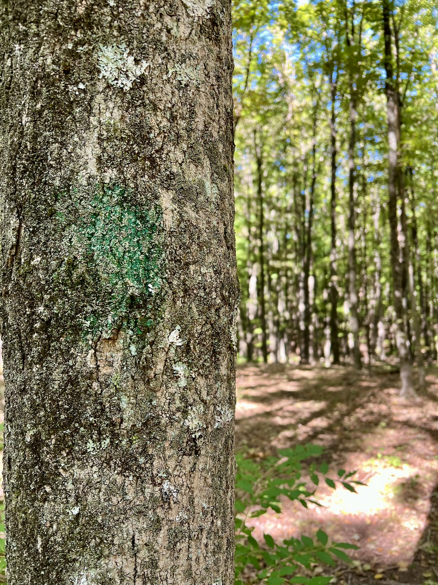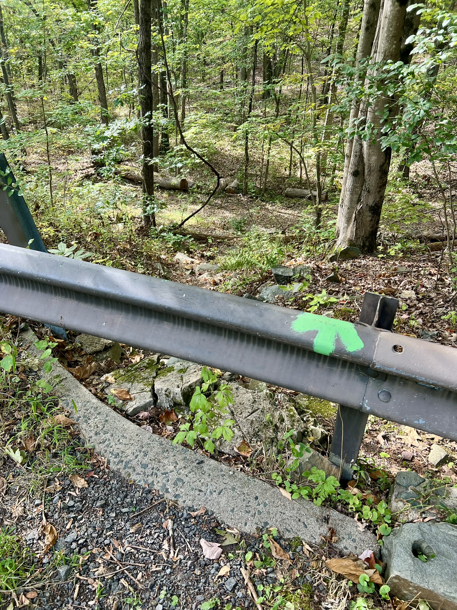 In late August we did a loop hike counterclockwise, starting at the Wintergreen Lake parking lot. We followed the white trail along the western edge of the lake, continuing south on red. We popped out on Baldwin Drive at a hairpin turn and went uphill to the right. We were so busy chatting that we forgot to look for the connection to the green trail at the next hairpin turn. When we realized this and backtracked, we noticed overgrown stairs to an abandoned pavilion building which I have since learned is the airshaft to the parkway tunnel. After making our way back to an obvious green arrow painted on the guardrail, we took the green trail uphill to the right. It meets the blue trail and then diverges again, running parallel to the blue trail to Judges Cave.