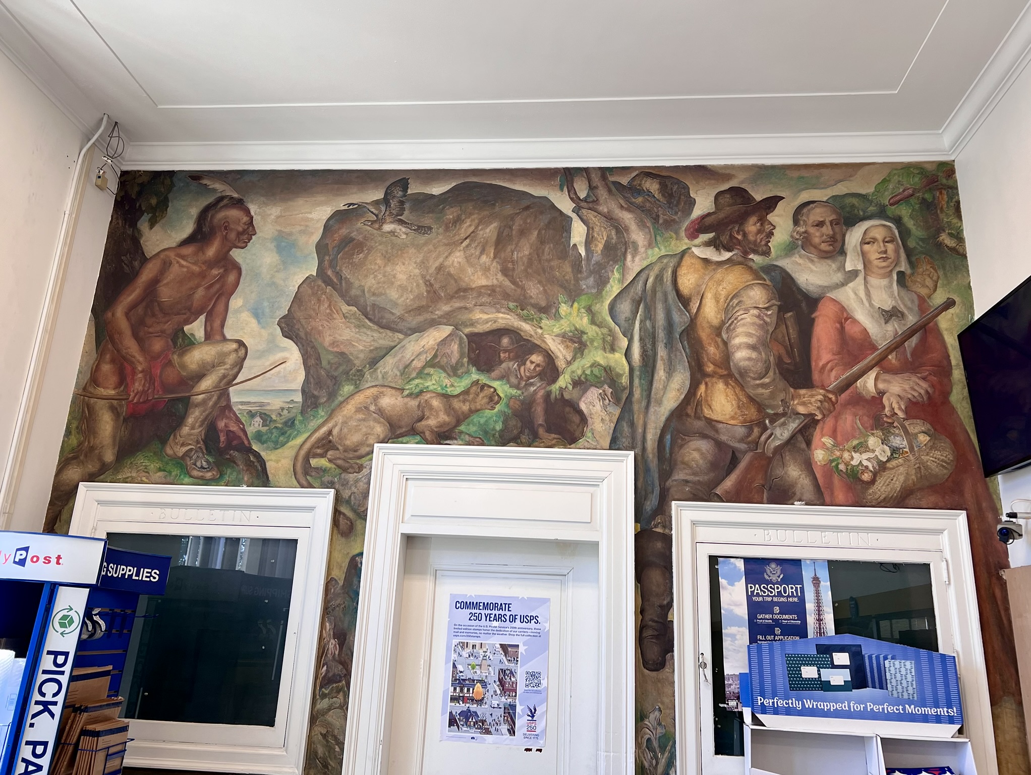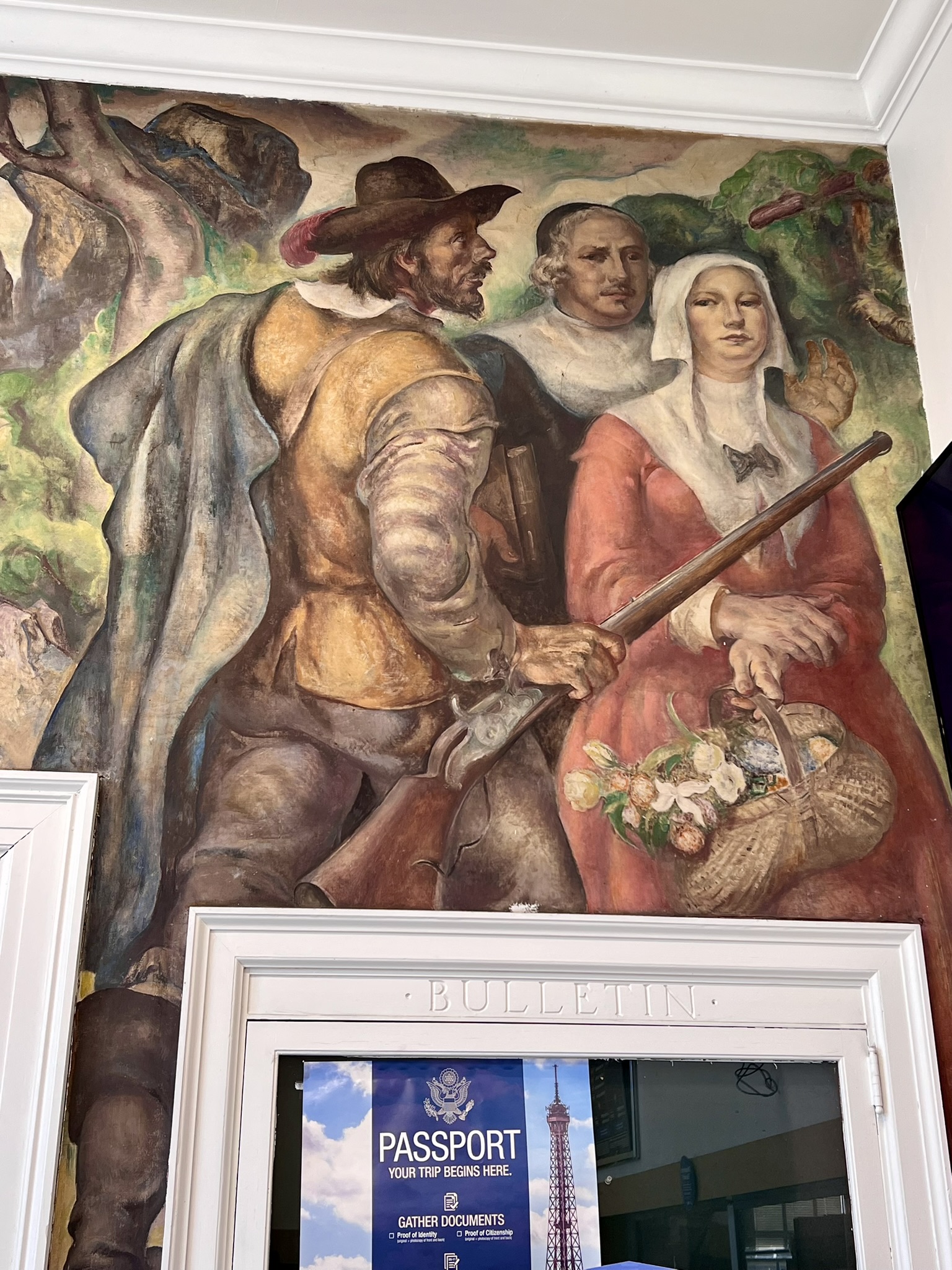 You may want to start your own pursuit of the regicides at the Westville (New Haven) post office at 95 Fountain Street to view the mural “The Pursuit of the Regicides.” This mural was painted in 1939 by Karl Anderson as part of the New Deal Section of Fine Arts Program within the Treasury Department to bring art to the people. According to the Public Art Archive “The Rev. John Davenport appears to the right — copied from a well-known portrait in the Yale University Art Gallery.” The mural’s other scenes – a local Native American and a mountain lion discovering the fugitives’ hiding place, are popular legends. When I visited I parked on Harrison Street (between Fountain Street and Whalley Avenue). Walking back to my car I had a superb view of the West Rock ridge.