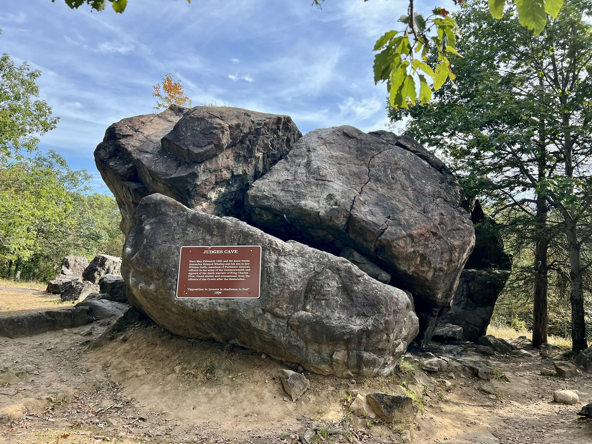 The Regicides Trail is a 7 mile trail that runs the length of West Rock Ridge State Park and is one of over 800 miles of blue-blazed trails maintained by the Connecticut Forest and Park Association. At the southern end, the trail starts by the South Overlook at the end of Regicide Drive, and in the north it connects to the blue-blazed Quinnipiac Trail. Judges Cave – the landmark where Whalley and Goffe allegedly hid from British bounty hunters – is accessible from both the trail and from Regicide Drive. According to the park website: “Regicide Drive, the 1.6 mile long road from Wintergreen Avenue to the South Overlook and Judges Cave, is open daily from Memorial Day weekend until the last weekend in October from 8 a.m. – 6 p.m.”