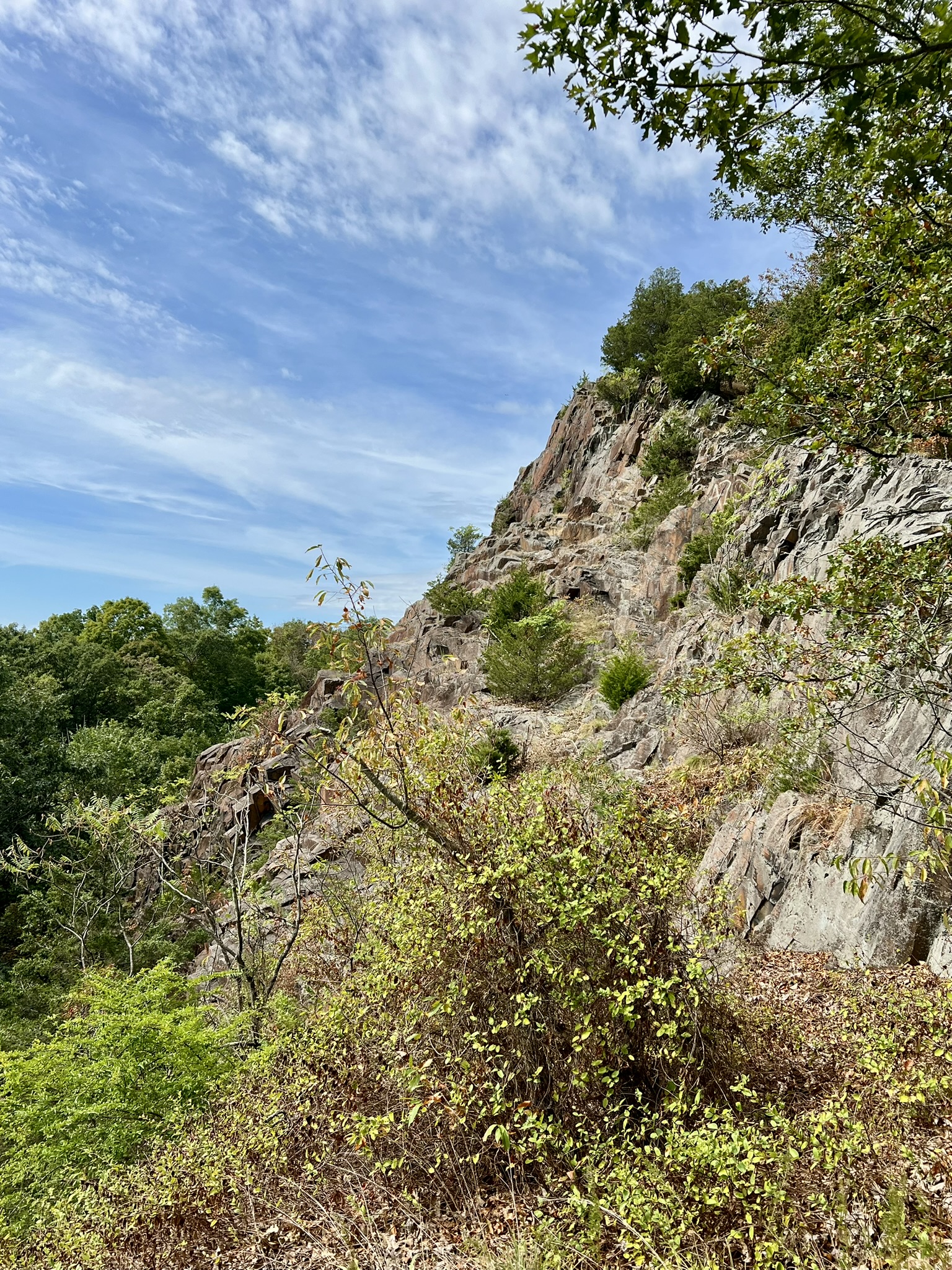 On my next visit, I parked at the trailhead parking lot just north of the Darling House (the Darling House is located at 1907 Litchfield Turnpike – Route 69). This Trail Map to the Bishop Estate and Darling House Trails was very useful. From the lot, a white-blazed trail enters the woods (marked blue on the map) to connect to the blue trail. At this junction, stay right to skirt the edge of a field. After crossing the West River, turn left at the next junction onto the blue/red trail. This passes through a nice open woods. At the next junction, turn left on the blue/yellow trail, which is blazed as a blue rectangle with a yellow dot. (The trail map shows the first section of this trail as blue, transitioning to blue/yellow after crossing onto Regional Water Authority property, but in the field it is all blue/yellow.) This is a gorgeous section of trail. The incline is gradual, with some flat sections and easy footing for about the first half mile. The landscape is dramatic, with the trap rock cliffs and talus slope visible through the trees. As the trail climbs it gets closer to cliff. For the last ¼ mile the trail is steeper and rocky. It meets the Regicides Trail just below the abandoned parking area along Baldwin Drive. If you do a strict out and back it is about 2.7 miles.
