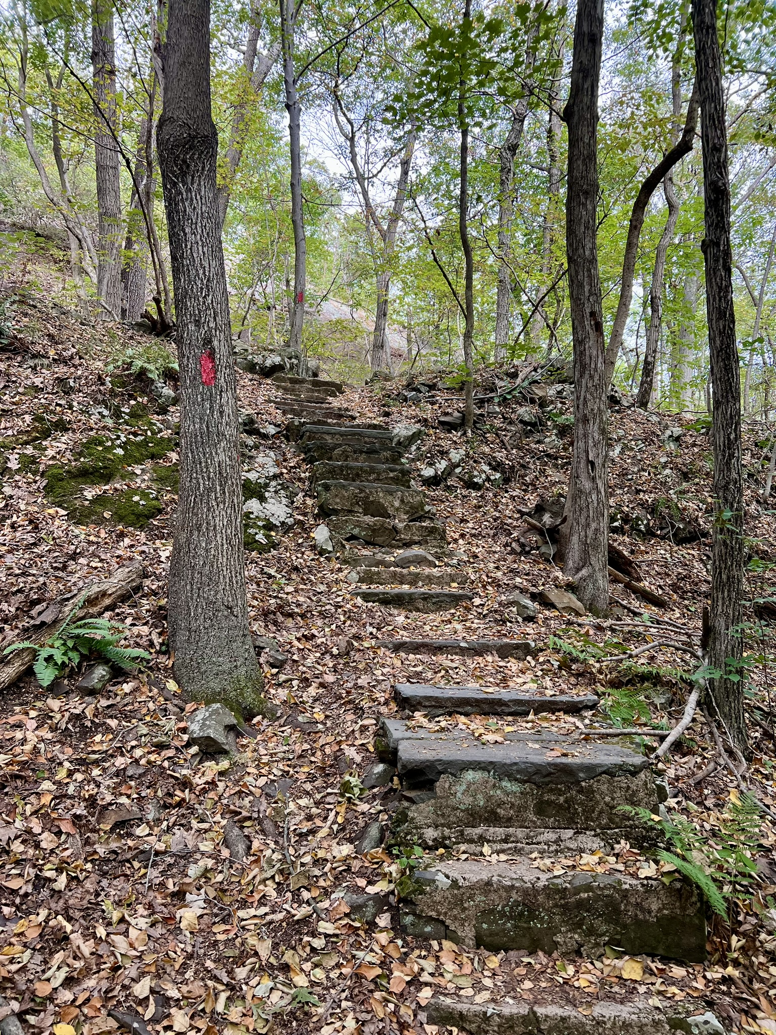 After the cave we took the blue trail as it continued south. The trail was rocky at times, with a steep drop off to the right – often with some railing protections but still intimidating. The blue/yellow Westville Feeder Trail forks down to the right. We stayed on blue as it continued toward the south lookout where there is a large pavilion and sweeping views of New Haven and the harbor. At the far end of the parking area we picked up the red trail, which was steep and rocky with a lot of old stairs built into the trail. We passed several overlooks with views both out to SCSU and of the cliffs.