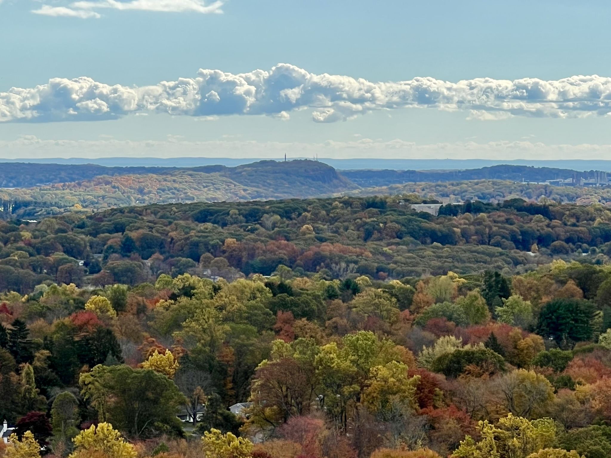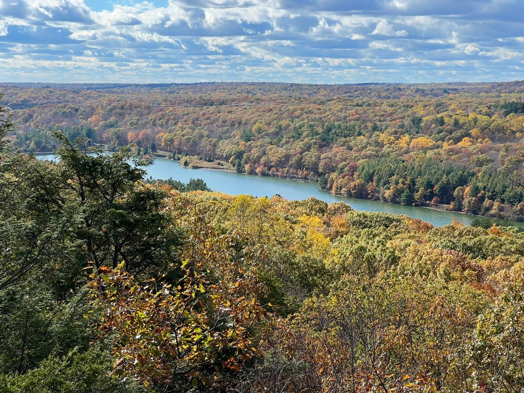 We returned in late October to see the park during fall foliage season and opted for an out-and-back in the north that would give us views to both the east and west. There is a parking area with room for several cars on Hill Street by Farm Brook Flood Pond. This is the red/white trailhead. We followed red/white until it met the red trail. We took a right on red, and stayed on the red trail at the next junction. This trail has several switchbacks as it climbs the ridge, passing some impressive rock formations. At the top of the ridge, the views over the pond with New Haven, the harbor and East Rock in the distance, were spectacular. We continued on red to its end at the junction with the blue-blazed Regicides Trail. We turned left on blue, crossing over the top of the ridge and Baldwin Drive to reach the scenic overlook above Lake Watrous. There are many options to extend your hike, but as we were pressed for time we made this our turnaround point.