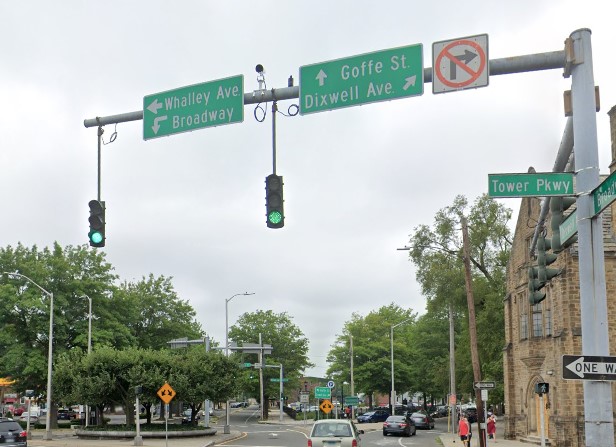 Whalley Ave, Goffe St and Dixwell Ave fan out from this intersection with Broadway in New Haven